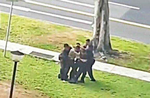 画面显示,七名警员紧紧捉著男子,但男子却发了疯似的奋力挣扎,一名警员还因此摔倒。