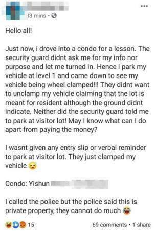 不过,公寓管理层负责人隔天答复该面子书贴文时,称女郎已经多次拒绝停在访客车位,而且还在泊车场内逆向行驶。由于屡劝不听,公寓保安才会锁她车轮。