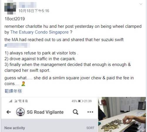 公寓管理层作出回应时称,当时女郎使用大量的硬币,缴付解除锁轮的160新元罚款。(取自面子书)