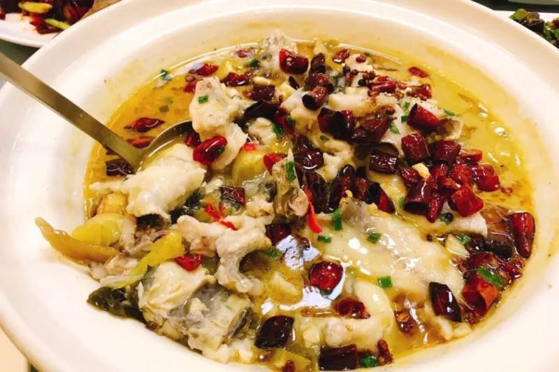 店里,自然少不了酸辣口的国民美食—水煮鱼酸菜鱼,人多的聚会满满一大钵端上来,爽!