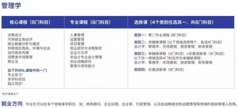 选择双专业是在我研究了大学学制后作出的决定。大学的商业管理本科共开设9个专业,除了会计学之外,其它每个专业的要求都是8门核心课+8门专业课+8门选修课。在选修课程方面,有4个类别可选,其中一种就是选择另一个专业的8门专业课程。