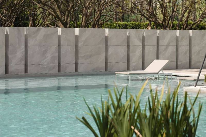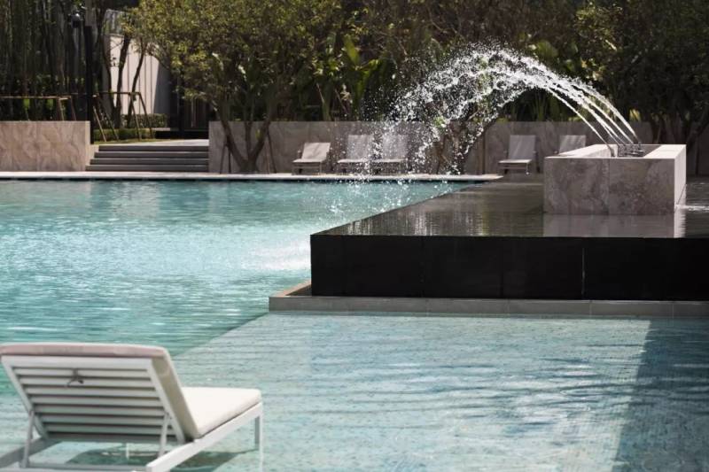 灰色大理石,犹如漂浮在水中的躺椅,小喷泉,在豁然开朗的空间里塑造出了清新自然的景致,令人身心放松,联想起蓝色海洋和白色沙滩交相辉映的热带风光。