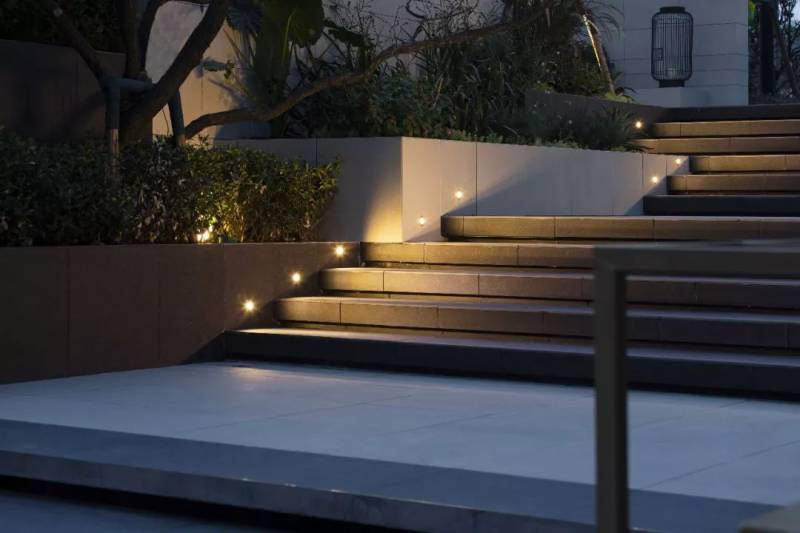 夕阳西下,漫步在社区中,灯光如点点星光点缀著静谧的夜景,暖色大理石纹理体块与花钵增添度假氛围,错落有致的树木营造出祥和舒适之感。