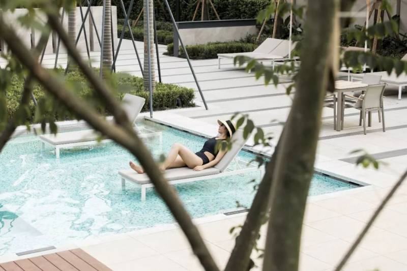 坐在泳池边,啜饮著一杯清凉的茶,尽情观赏室外的满目绿色,享受惬意的休闲时光。