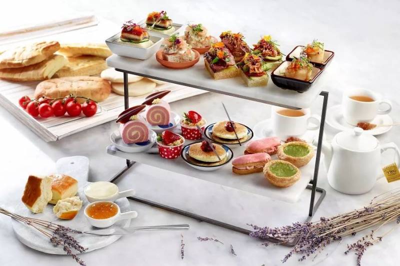 这里有了10种TWG茶,新鲜烤饼,可口的三层托盘中的美味甜食。