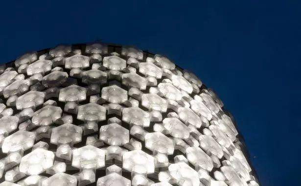 将节能灯泡置入六边形透明灯罩之中,有序排列在外立面上,夜晚在灯光的照射下散发着耀眼的光芒。