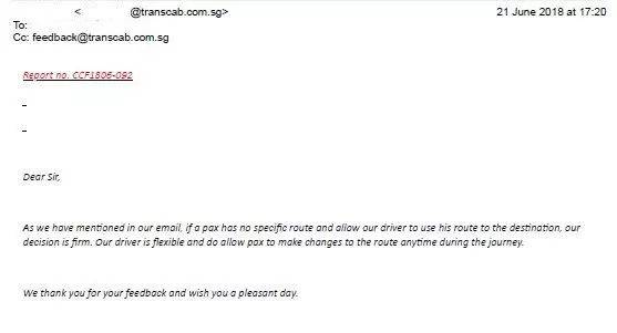 当我要求为绕路多收的钱双倍赔偿时,Trans-Cab的回复到:乘客没有指定路线告诉德士司机,那么Trans-Cab公司允许司机灵活改变路线,司机的做法是被公司认可的。