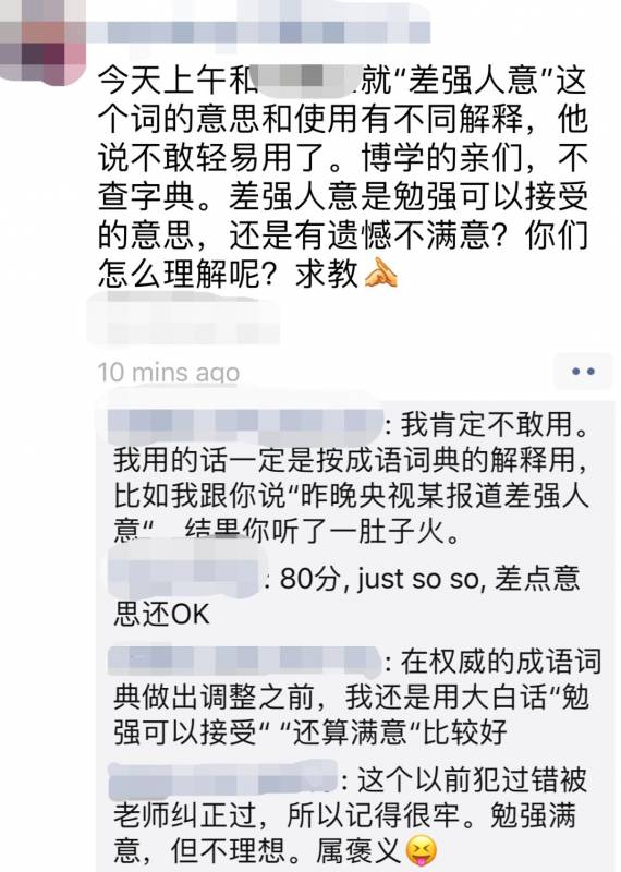近年来曾有人提出,对“差强人意”这个成语的理解和使用应从俗从众,发现问题的网友认为在权威的成语词典作出改动之前,他会尽量使用白话来表达相同的意思。