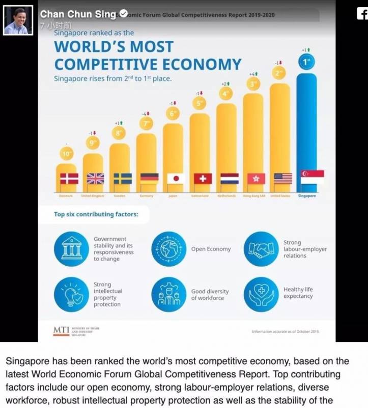 难得的是,这次,新加坡竟然一举超越霸榜N年的美国,在世界经济论坛(WEF)周三(10月9日)发布的年度《全球竞争力报告》中,排名第一,一举成为全球最具竞争力经济体!