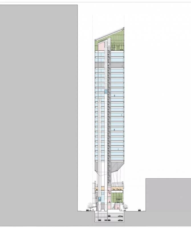 平台的体量略高于街道平面,这一设计手法旨在增强其从地面入口到中庭花园的宽敞性和连续性。中庭形成了办公大厅、零售和餐饮空间的核心,而面向罗宾逊路的落地窗促进了室内和街道景观之间的对话。
