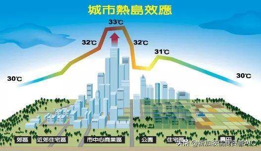 新加坡也很容易出现"城市热岛效应"(热岛效应是由于人们改变城市地表而产生的小气候变化的综合现象,年平均气温会高于市郊1摄氏度甚至更高),因此增加城市绿化也可以有效地缓解气温升高现象。