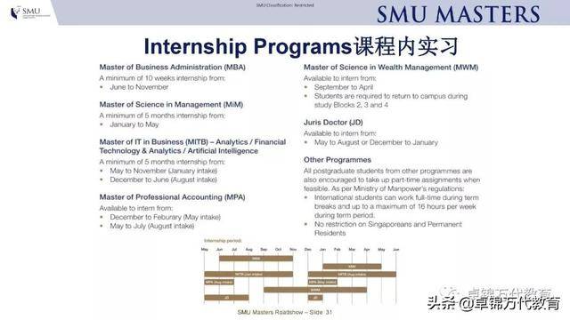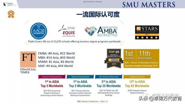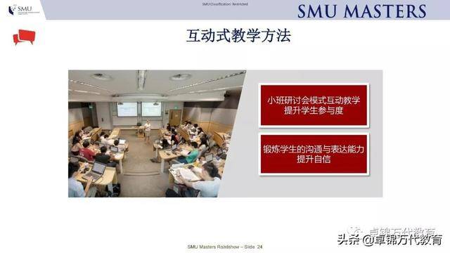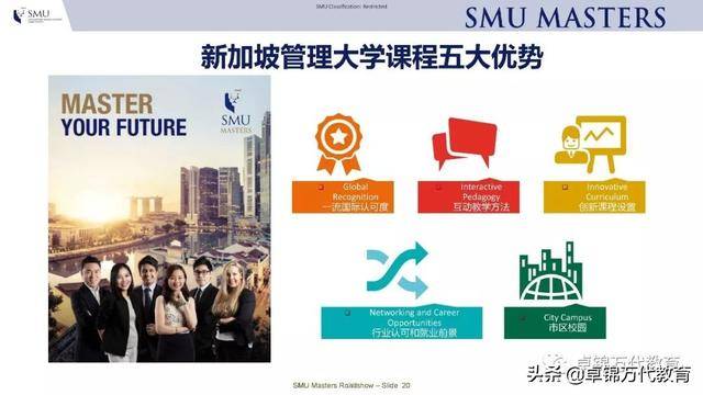 招生官告诉我们申请SMU的研究生课程最快可以一年完成,学费在20万人民币左右(如选择两年完成学费总价不变),课堂学习与校外实习同时交叉进行,学生在学有余力的情况下还可以选择合法打工。一年研究生毕业后,学生在新加坡也很受欢迎,就业的起薪最低在4000新币左右(按照5的汇率,折合人民币2万元左右),而根据与两位老师的交流,我们还得知,其实目前有不少的学生毕业后都会选择回国就业,因为获得的职务和薪水竟然比在新加坡还要高呢。为什么新加坡管理大学的文凭如此受到认可,接下来我们就详细为大家介绍下: