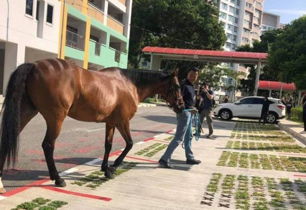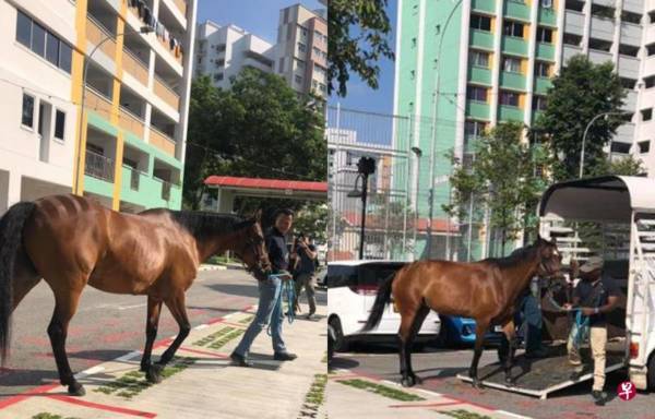 《联合晚报》报道,义顺环路第330座组屋附近的有盖篮球场,前天(10月16日)出现两匹骏马,引来居民驻足围观。马儿也无畏居民的好奇眼光,在篮球场来回踱步,悠然自得。