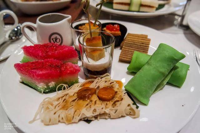 National Kitchen by Violet Oon位于新加坡国家美术馆内,取名为“国家厨房”,是要向世界各地的吃货们介绍本土美食。这是一家娘惹餐厅,下午茶自然也不是传统英式的三明治和司康饼,而是本地风味的小点心。例如上图中金黄色的网状饼(Roti Jala),是传统的娘惹煎饼,搭配着椰糖;绿色的叫做青条(Kueh Dah Dah),馅料是碎椰肉和椰糖,外皮的绿色来自班兰叶。咸味的茶点有椰浆饭三明治、仁当牛肉包等等。