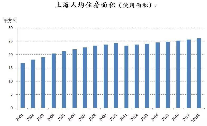 2018年,上海人均住房使用面积为26.1平方米,低于新加坡但明显高于香港的住房面积。2001年至2018年,人均住房使用面积提升了10平方米左右。