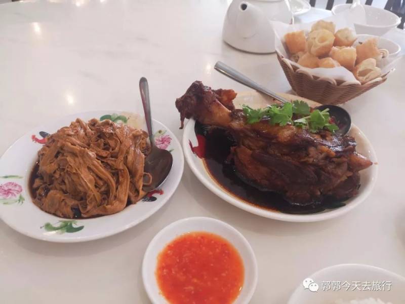 中午体验了新加坡超出名的肉骨茶套餐,配上了一个酱肘子,同行的人都把肉骨啃完了,我就默默的啃大肘子吧。谁让我咬不动呢...肉骨茶的汤超级好喝,胡椒味略重,吃到汤底会有点咸,但是可以无限续汤!个人觉得比肉要好吃。特别是泡上油条后,一顿中饭吃的饱饱的。
