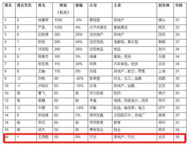 《2018胡润80后富豪榜》中,王思聪位列第16位;17年《中国顶级投资人排行榜TOP50》中,当时年仅29岁的王思聪,位列第37名,是其中最年轻的富豪。