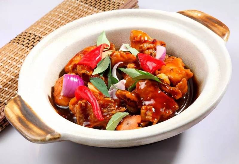 云南人的招牌菜是汽锅鸡。这里只使用黑脚鸡。这道菜是用手工制作的煲做的。汤在无水的锅中烹煮,经过三个小时的高压,汤既清澈又浓郁,没有油腻感。