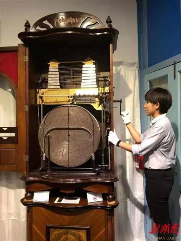 在一个Polyphon(复调)品牌的巨型音乐盒前面,只见Rainey一个健步、“咚”地一声,登上了旁边一个小木箱。带着白手套的Rainey摇动起一个一尺来长的手柄,开始哗啦哗啦地给这个大音乐盒上发条,英武潇洒得活像一位海船上的水手。