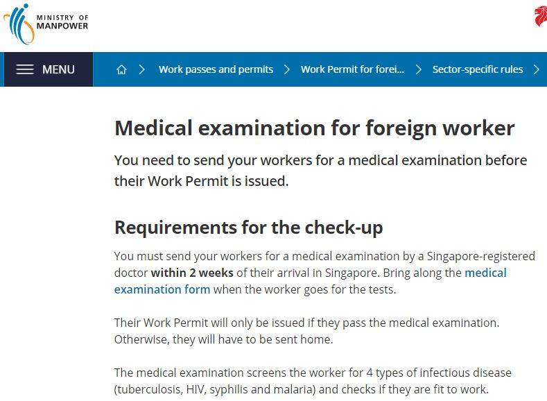 新加坡人力部则要求外劳和外籍帮佣在申请工作准证(Work Permit)时必须先检查是否有肺结核、艾滋病,梅毒或疟疾等传染病。