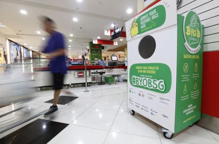 新加坡8个超市商店推出可重复使用袋的捐款箱
