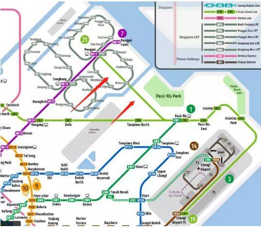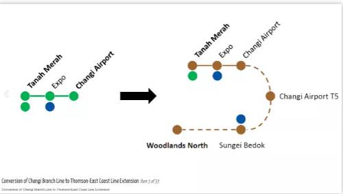 即将在今年底开始分阶段启用的汤申—东海岸线(棕色线)将延长到樟宜机场T5,和目前的绿线上的樟宜机场站连结。