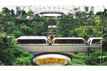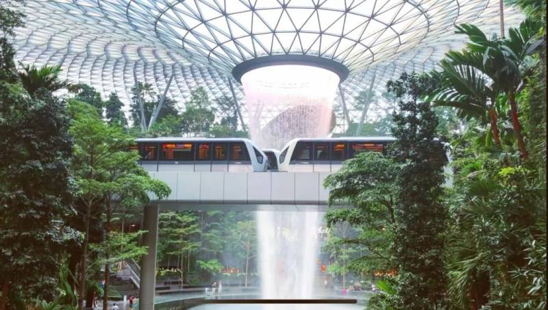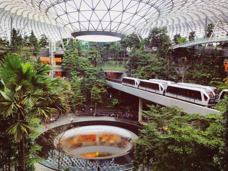 这个巨型植物园是商场的中心花园,天幕上巨大的瀑布水柱倾泻而下,空中轻轨车穿梭往来。这是科技和自然结合的极致代表了吧。