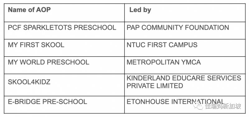 主要业者幼儿园是新加坡的幼儿园监管机构ECDA(Early Childhood Development Agency)精心挑选的合作幼儿园。全岛有5家主要业者,共经营572所学前教育中心。