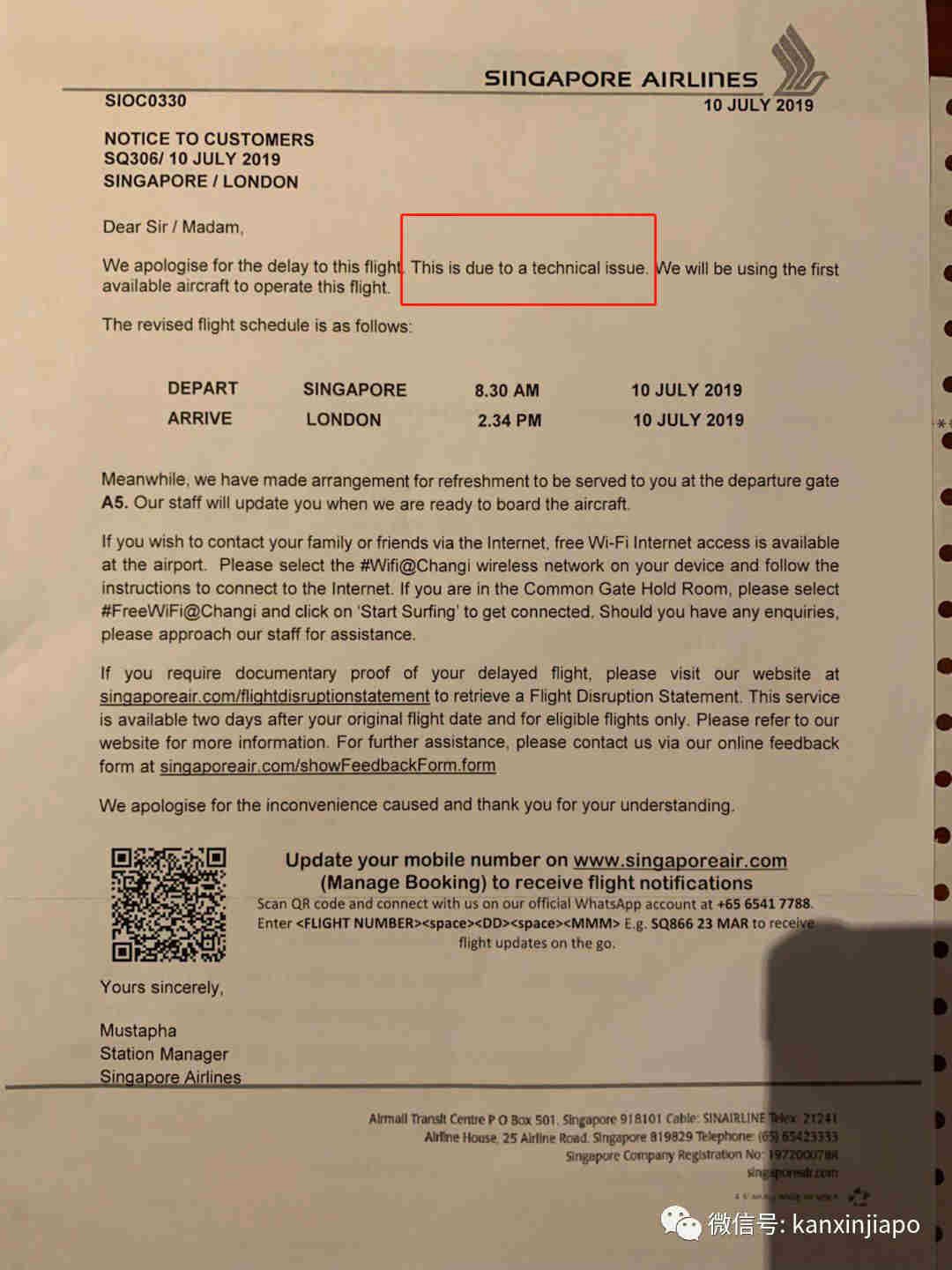新航随即给乘客发来道歉信,信中预计的起飞时间比原计划整整晚了7个小时。