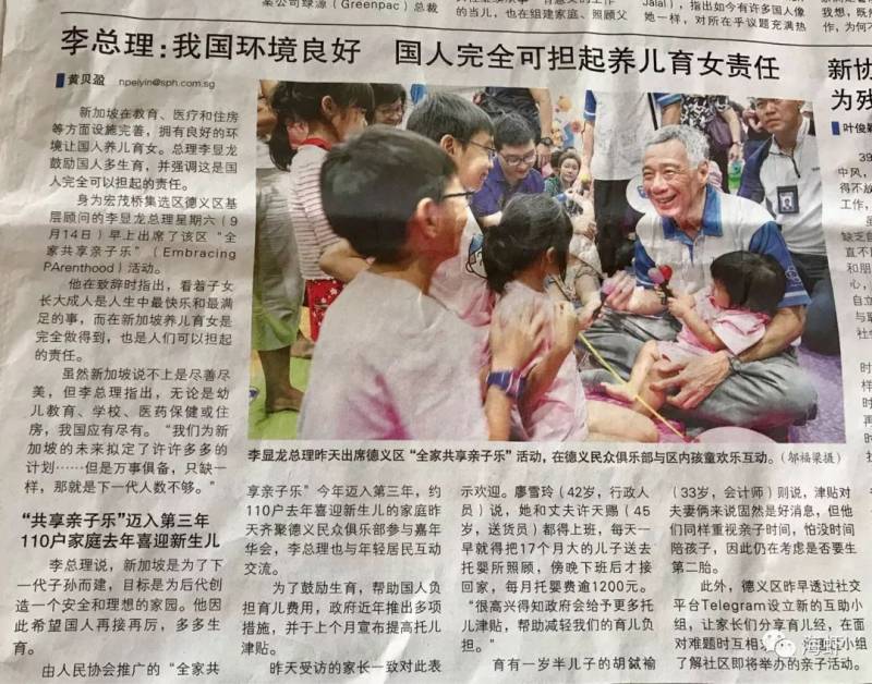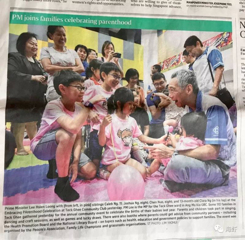 更惊喜的是,隔天新加坡两大报纸,最大的英文报《The Strait times》(海峡时报),以及最大的中文报《联合早报》,都刊登了李总理一边抱着小可儿,一边与三个大的孩子亲切对话的温馨画面,其中《海峡时报》上还特地对四个孩子做了介绍。
