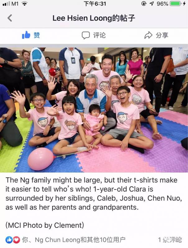 总理Facebook上的这段英文,便是对我们家的介绍,大意是说:黄家可能很大,但是他们的T恤很容易分辨谁是谁,1岁的Clara(可儿)被兄弟姐妹团团围住,Caleb(轩),Joshua(睿)和陈诺,还有她的父母和祖父母。