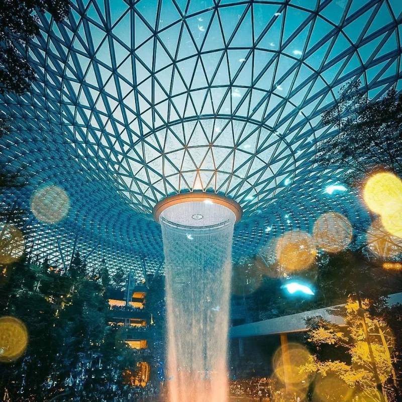 星耀樟宜内的汇丰银行雨漩涡是全球最高的室内瀑布,从 40 米高空倾泻而下,气势雄浑地灌入星耀樟宜的最深处。夜色中,当音乐响起时,汇丰银行雨漩涡将顿时变成40米高的水幕,上演缤纷绚丽的水舞声光秀。千变万化的灯光投射让人目不暇接,雨柱和光影在音乐节奏中跳动,再加上水雾效果的作用,有了和白天完全不同的炫目效果~很多第一次看到这些景观的游客,都有被这些瀑布震撼到。