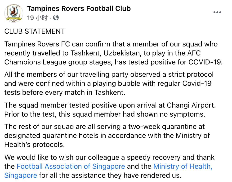 图源:淡滨尼流浪队facebook近期到乌兹别克的塔什干(Tashkent)参加亚洲足联冠军联赛小组赛的淡滨尼流浪队的一名球员,在入境新加坡时,新冠检测结果为阳性。目前,其余运动员在特定隔离设施中继续接受两周隔离中。