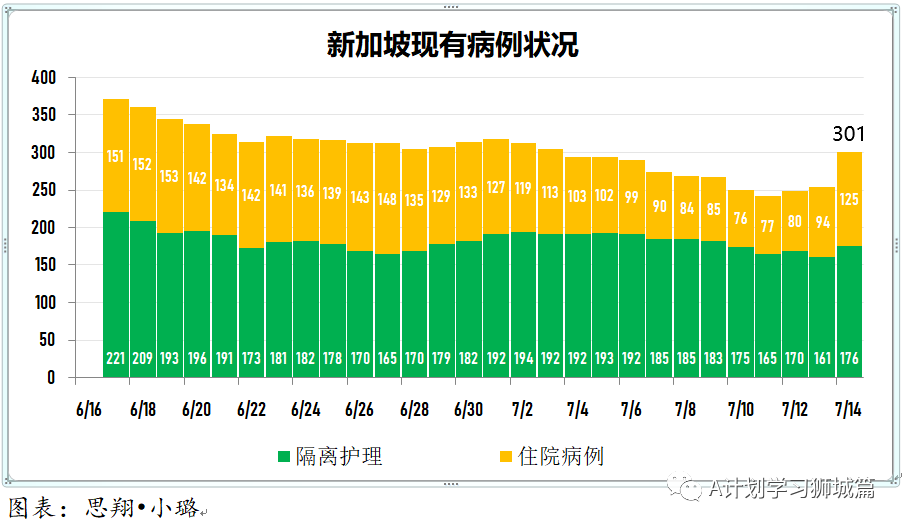 新加坡现有冠病病患共301人,其中住院125起,隔离护理176起。