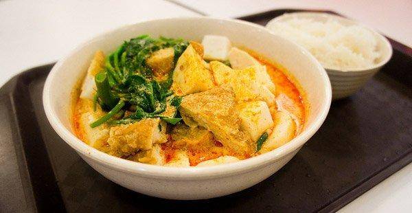 这道菜在马来西亚和新加坡比较常见,和国内的麻辣烫有些类似。 源于传统的客家菜肴,在豆腐内填入馅料制成。酿豆腐的馅料种类 繁多,一般为鱼肉或猪肉蓉,还包括辣椒、豆角、豆腐、苦瓜、蘑 菇、豆皮、茄子等。汤头偏清淡,可以选择吃“干”或“汤”,也 可以搭配米饭、面或米粉,辣椒和甜面酱是必不可少的配料。