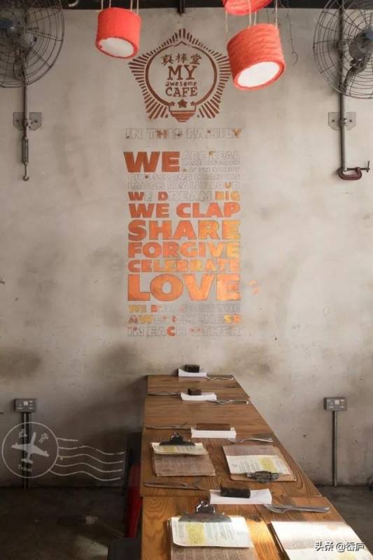 一面老旧的墙上,随性涂鸦写着,“Laugh Dream Clap Share Forgive Celebrate Love”等字样, 自由随性,充满艺术感。工业风的红凳子,十分抢眼。