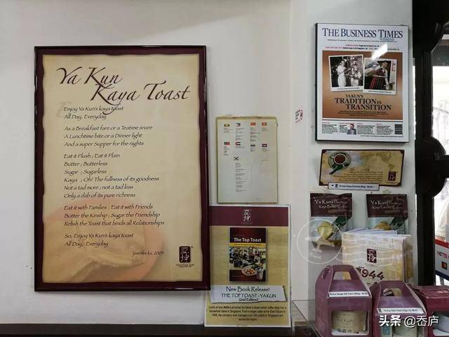 店内墙上有不少关于亚坤起家的历史报道。从一间小小的Kopitiam(咖啡街坊店)起家,亚坤已发展成拥有60多家分店的连锁品牌。伴随着新加坡经济的腾飞,亚坤也成为当地不可缺少的美食风景。