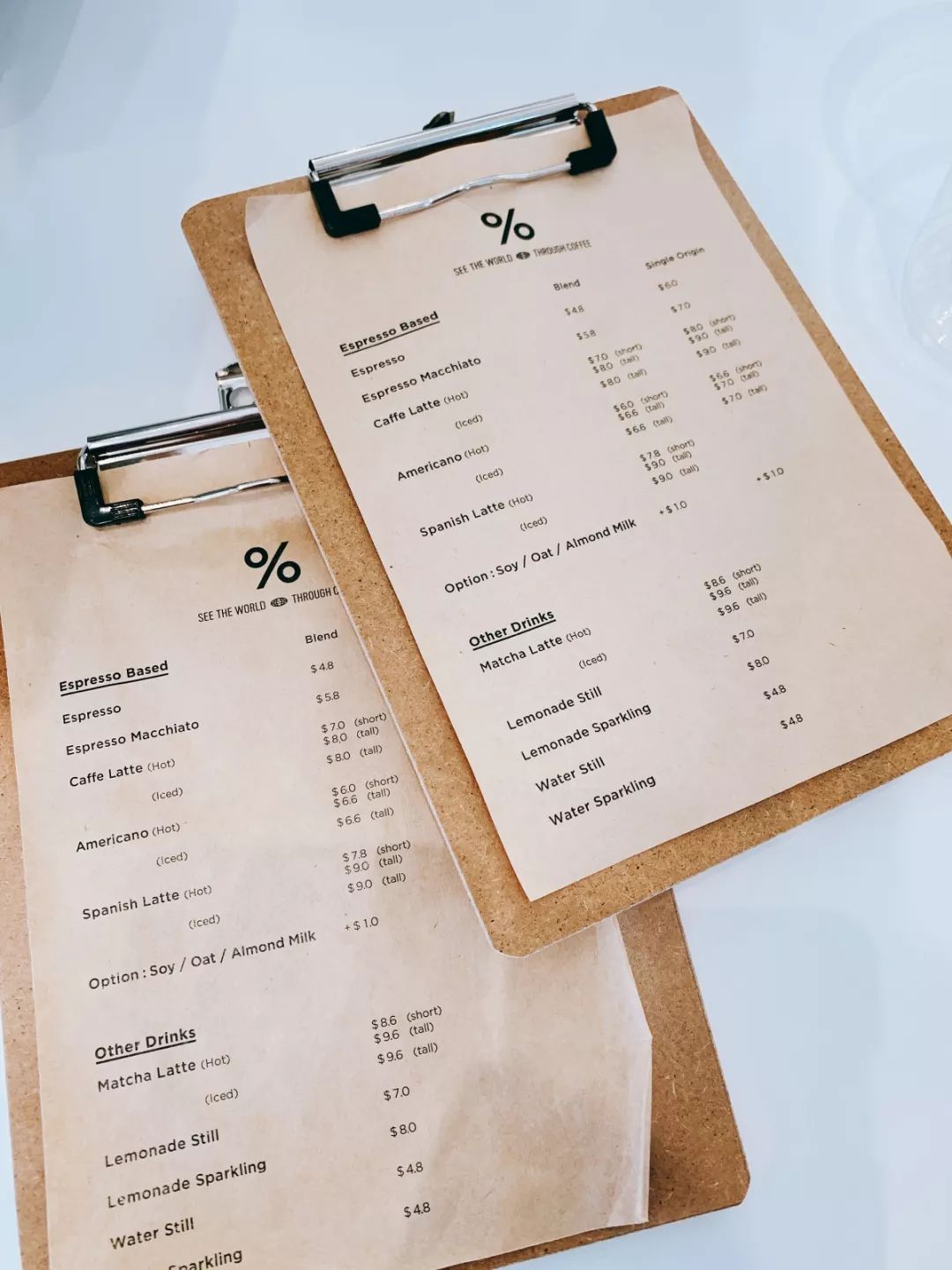 Menu是印在牛皮纸上的,是有质感的高级。店里主打Espresso,玛奇朵,拿铁和美式。大部分咖啡定价是在S$5-S$8块的。额外S$1可以换成豆奶、燕麦奶或杏仁奶。