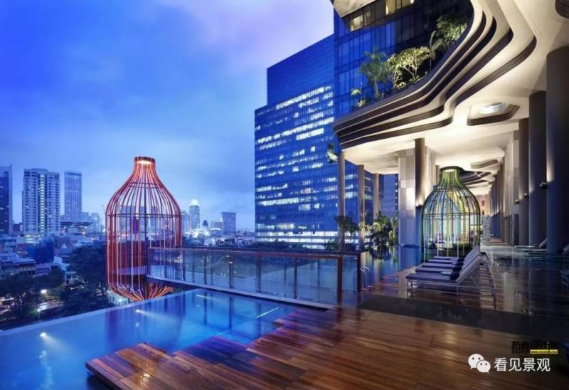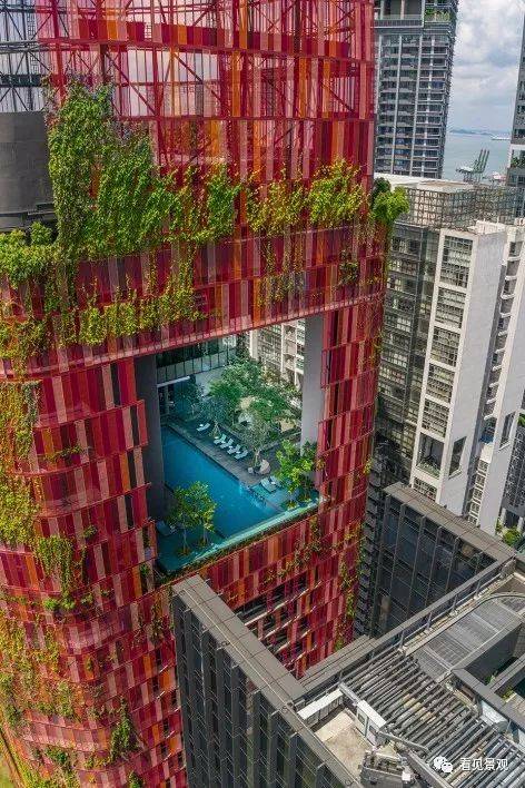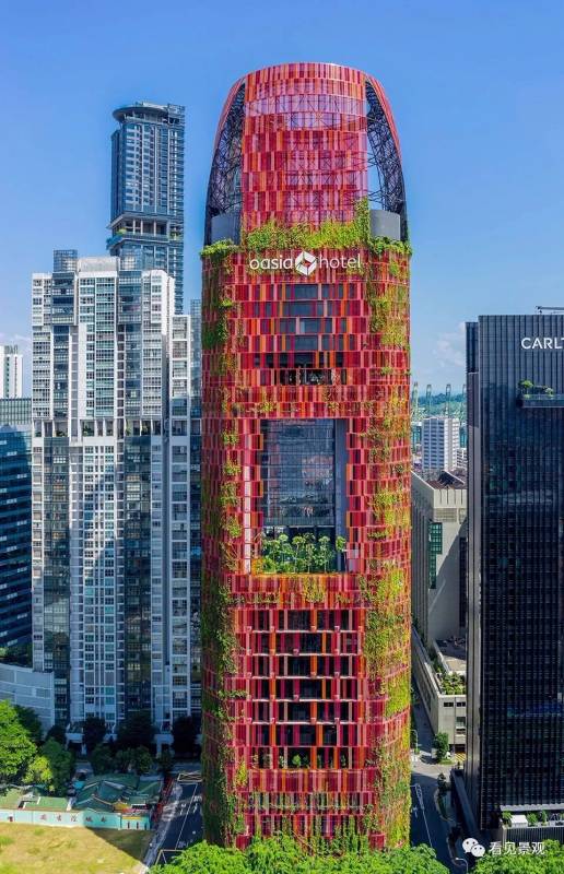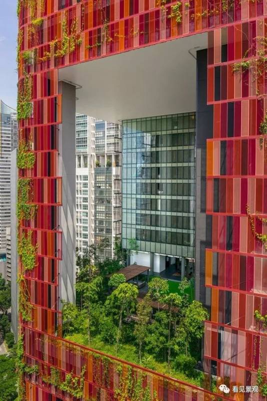 WOHA所设计的Oasia酒店耸立在新加坡高楼云集的中央商务区之中,而无论室内亦或室外空间,景观的用途被进一步扩展,成为了立面建筑材料中不可或缺的一部分。在鲜红的铝制金属网的映衬之下,21种攀缘植被的显得青翠欲滴,五彩缤纷的花果夹杂其中,为鸟类与昆虫提供了充沛的食物。