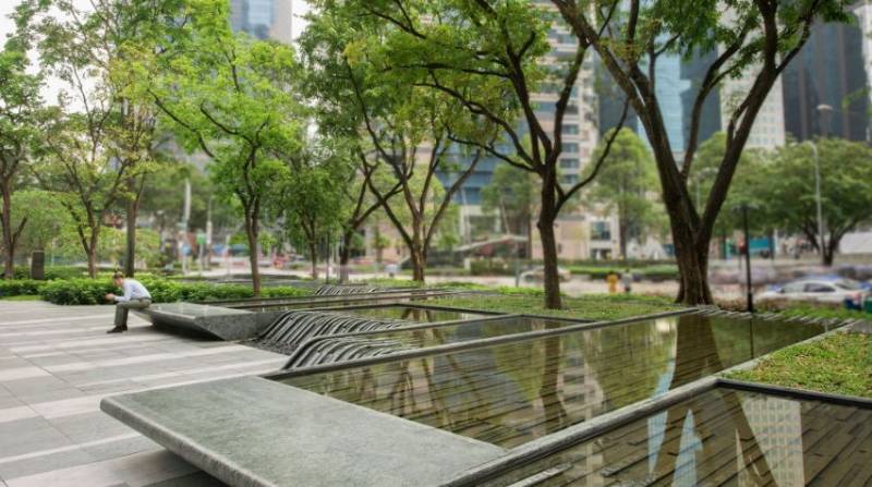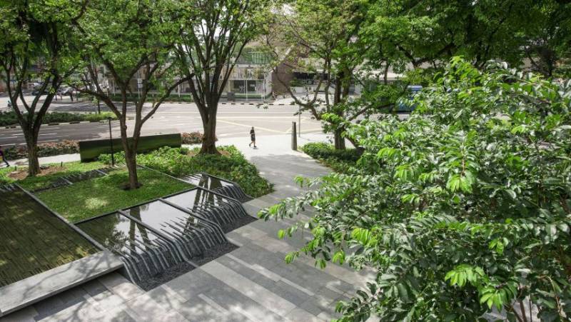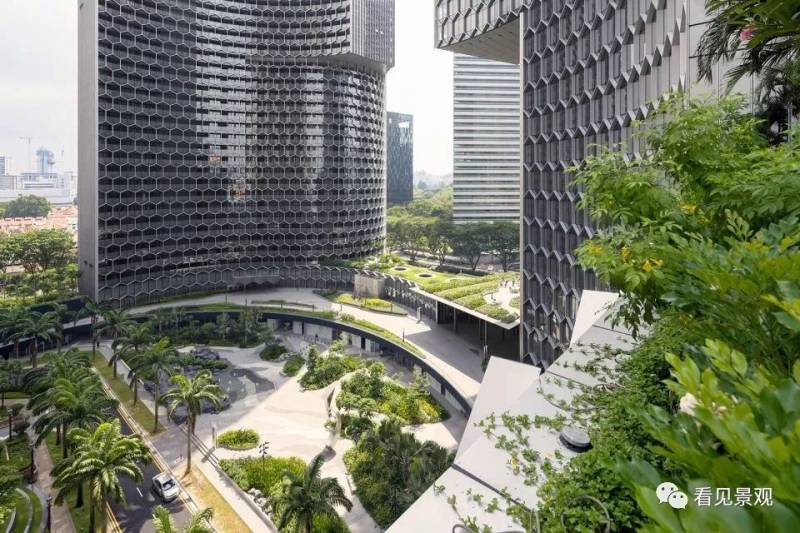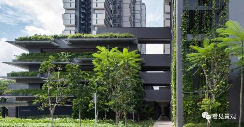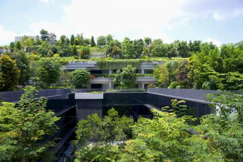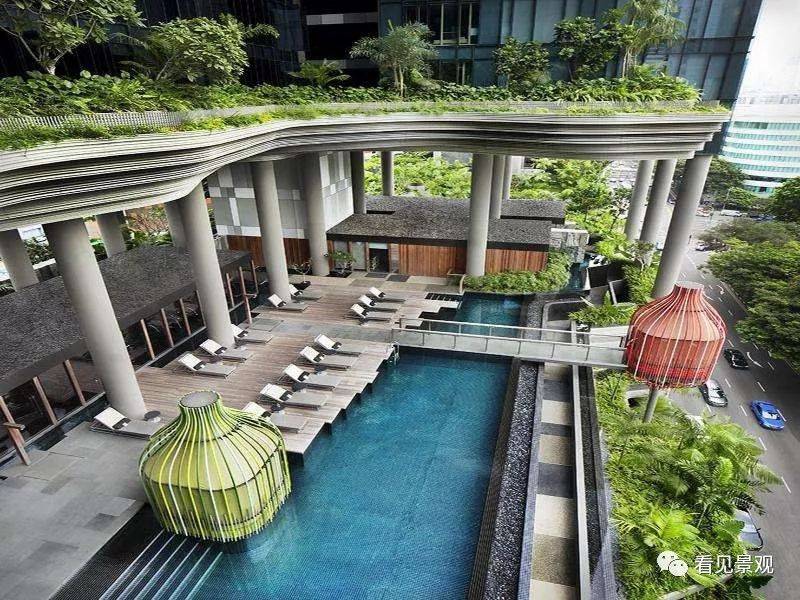 新加坡的建筑事务所WOHA一直是绿色城市的倡导者,将绿色从自然引入城市。PARKROYAL on Pickering被设计成为一个率容量倍增的“花园酒店”,美丽的热带花木与棕榈树点缀著空中花园。如此繁荣茂盛的绿色与周边临近公园连成一气,形成连续的绿色景观。