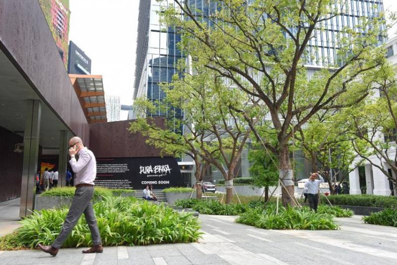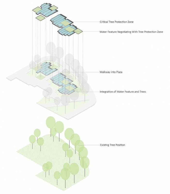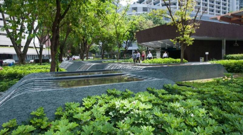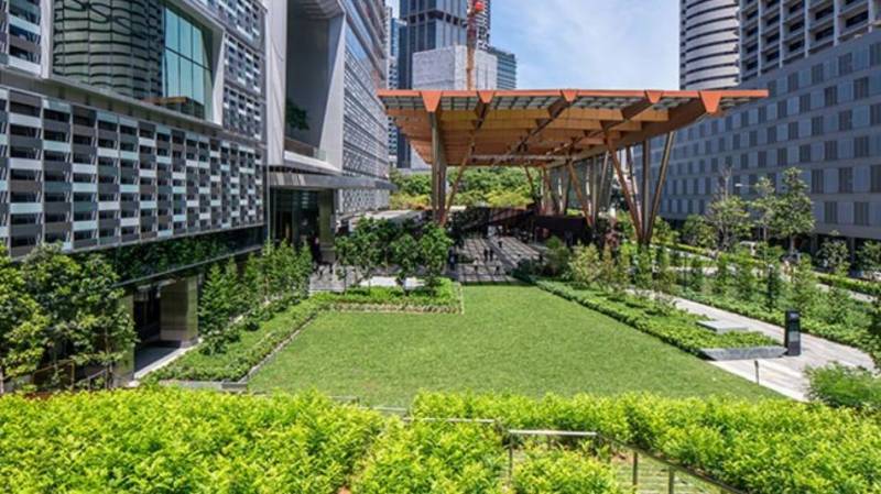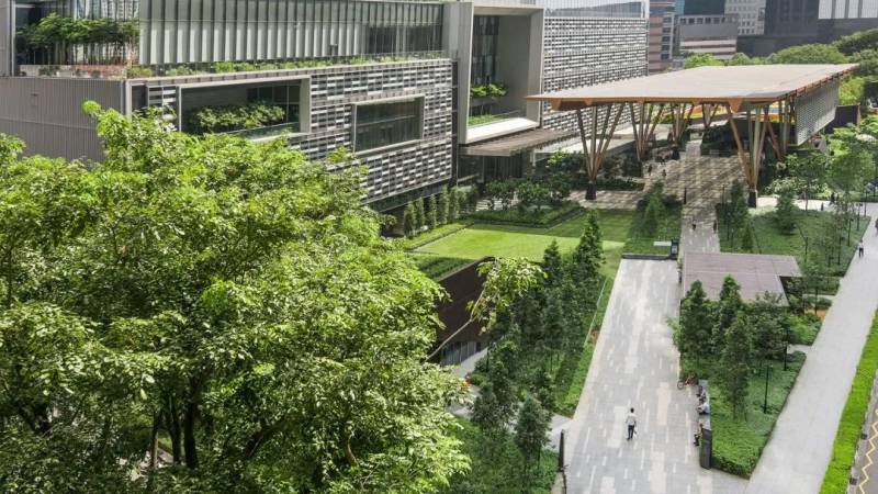 丰树商业园是shma事务所景观作品。项目坐落于新加坡岛的西部,是一个以口岸和仓库为主的工业区域。除了毗邻肯特岗公园自然保护区以外,该区域的开发一向对自然环境考虑得不甚充分。该项目所在的场地面积为35000平方米,曾完全被混凝土表面的多层仓库建筑覆蓋。由于新加坡的办公空间需求量不断上升,委托方决定将仓库拆除,并将其改造为现代化的办公场所,与前方已经建成的一期办公大楼相连接。考虑到全局的规划,全新升级的二期建筑被安置在场地的北端,从而使位于一期和二期中心的宽阔开放空间成为一个共享式的户外活动场所,同时以绿色植物替代建筑原先的硬朗表面。