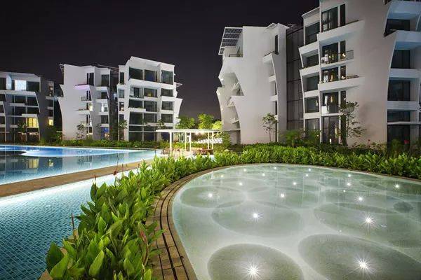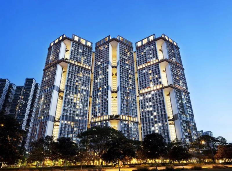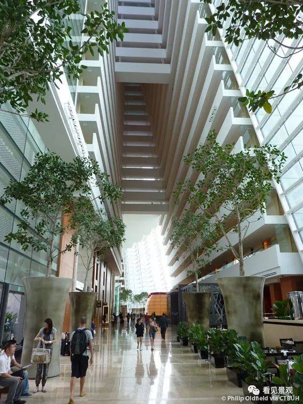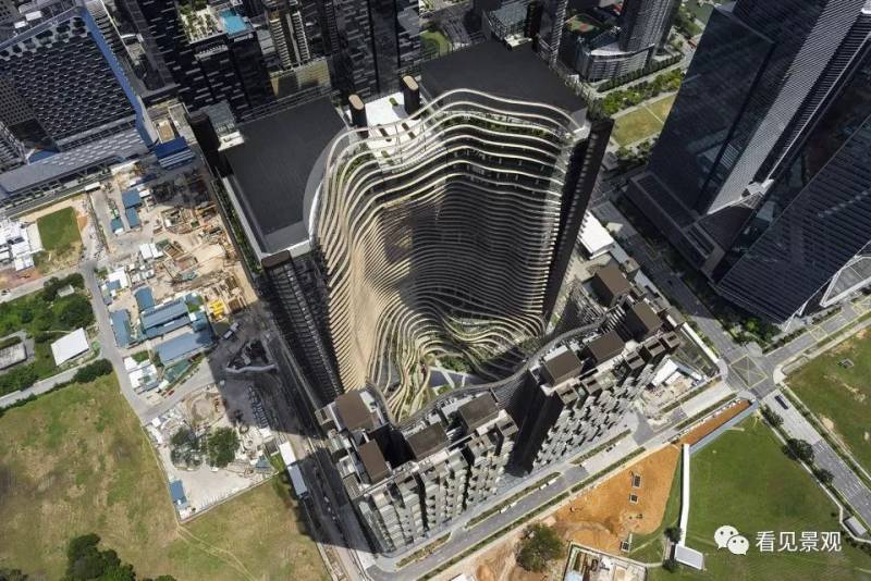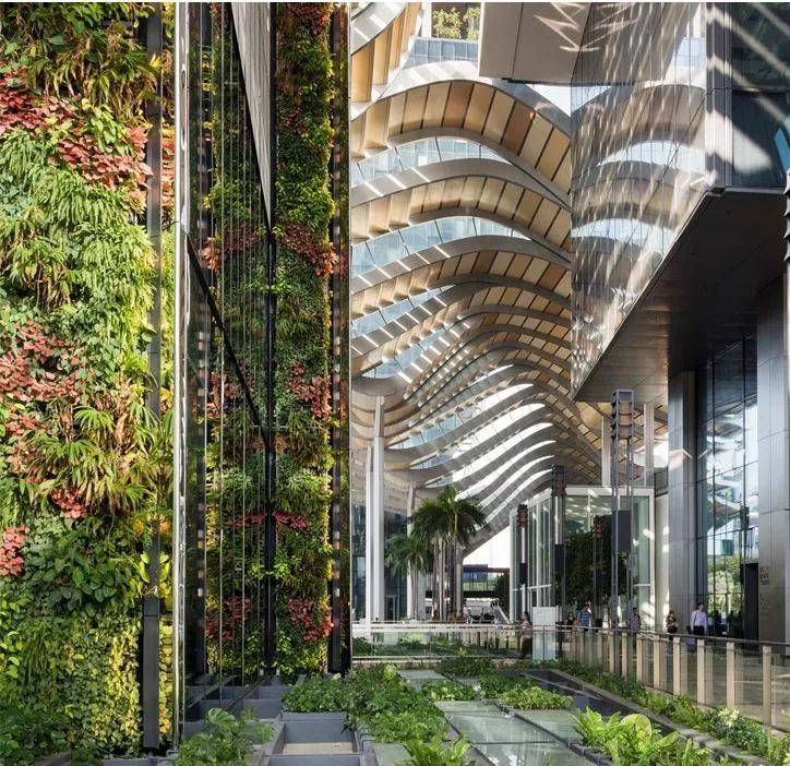 滨海盛景(Marina One)是ingenhoven建筑事务所迄今为止最大的建筑项目,德国著名建筑大师英恩霍文(ChristophIngenhoven)操刀。位于寸土如金的滨海湾新金融区,却奢华地创造了一片比足球场还大的绿色空间。于2018年1月15日揭幕。这座高密度的多功能综合体占地40万平方米,由四座高层建筑组成,其内部包含一个扩展至多层的公共空间,即“绿色之心”。这座立体的绿洲反映出热带风情所具有的多样性特征。滨海盛景的四座高层建筑包含办公、住宅和零售等多种功能,并获得绿色建筑白金奖以及LEED的白金级认证。