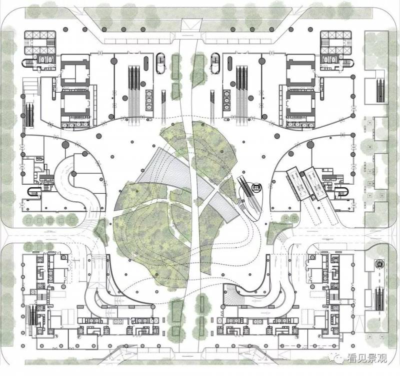 “DUO的主要目的是回馈城市,”舍人表示,“我们不想要一个封闭的社区或私人空间,所以我们打造了这个24小时开放的公共空间,并将它与周围城区的不同元素连接起来。整个公共空间变得非常有序而通透,流水般多变的几何造型使人们可以从任一方向穿过它,极大地便利了人们的出行和活动。”