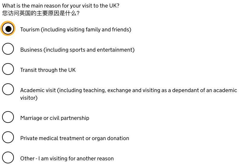 18. 说明您去英国的目的,申请旅行签证我们就选第一个选项“Tourism”就可以了。