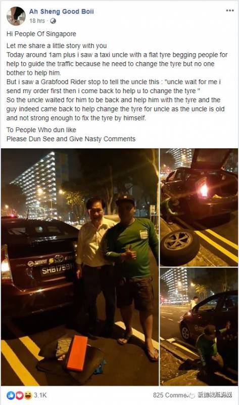 这时,我看到一名 Grabfood骑士停下来跟司机大叔说:“Uncle,等我送完这个订单后,回来再帮你换轮胎。”