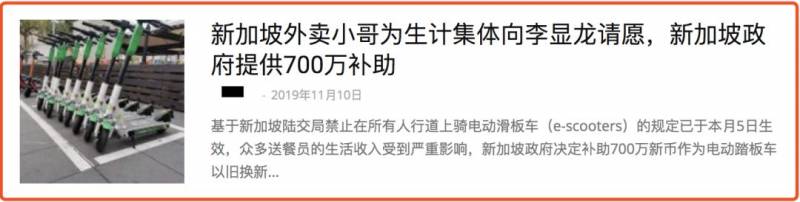 11月6日,近30名送餐员在新加坡总理李显龙接见选民的活动场所进行请愿,因此新加坡政府决定投入700万新币作为电动踏板车以旧换新的补助金。