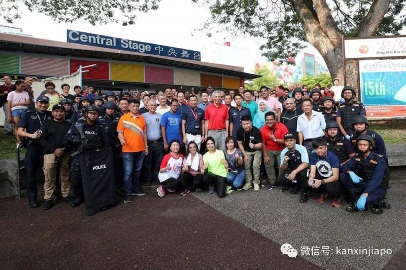 其实,这只是一场由新加坡警察部队和民防部队联合举行的反恐演习。李显龙与其他同区议员一同参加了这次全国保家安民计划(SGSecure)路演,事后与路演参与者合影。