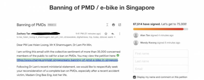 这起事件在网上引起热议,网友Zachary Tan发起的“新加坡PMD/电动自行车禁令”截止发稿前,已经获得了近六万八千个请愿签名。