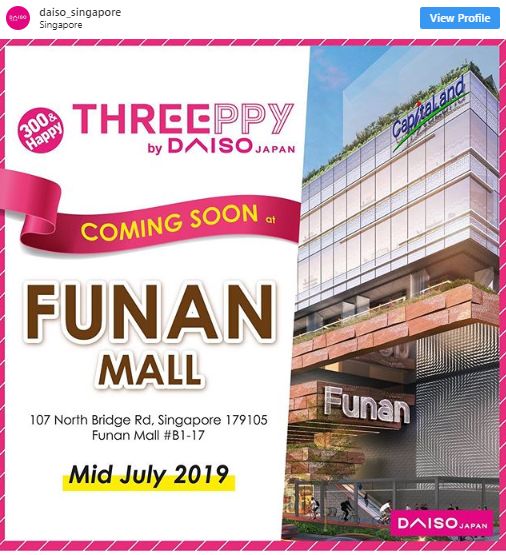 店名:Threeppy by Daiso地址:107 North Bridge Road, #B1-17 Funan Mall, Singapore 179105 (福南商场负一楼)开业日期:2019年7月14日
