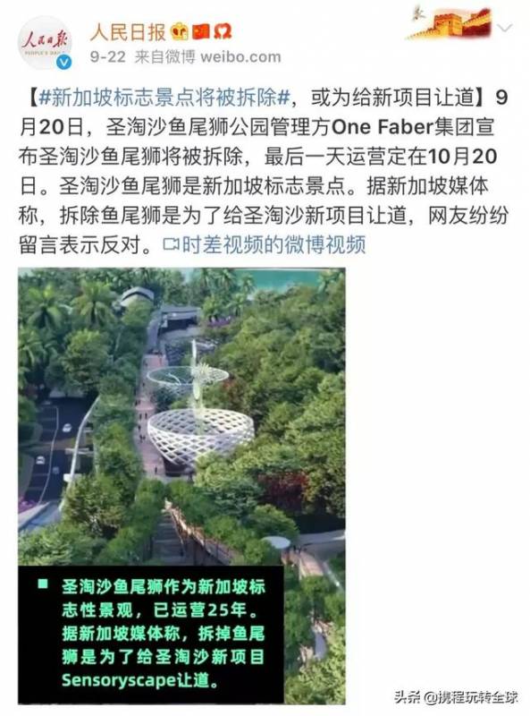 据新加坡媒体称:拆除鱼尾狮是为了给圣淘沙新项目让道。